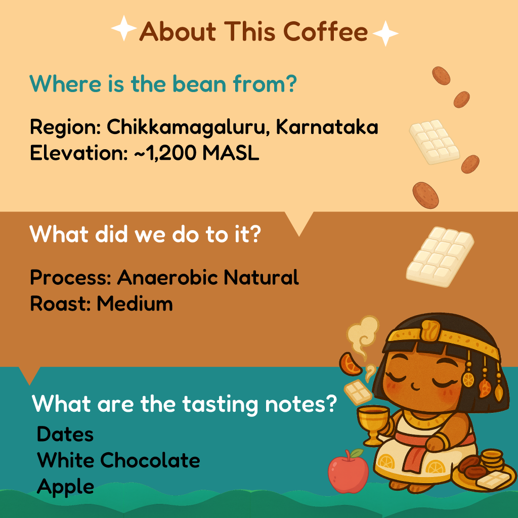 Medium roasted coffee beans (and ground if you want it that way), born in the hills of Chikkamagaluru, Karnataka. Tells a complex flavour story and offers a versatile ability to go black as well as with various mixes across lemon, honey, milk, fruit juices, tonic and sodas.