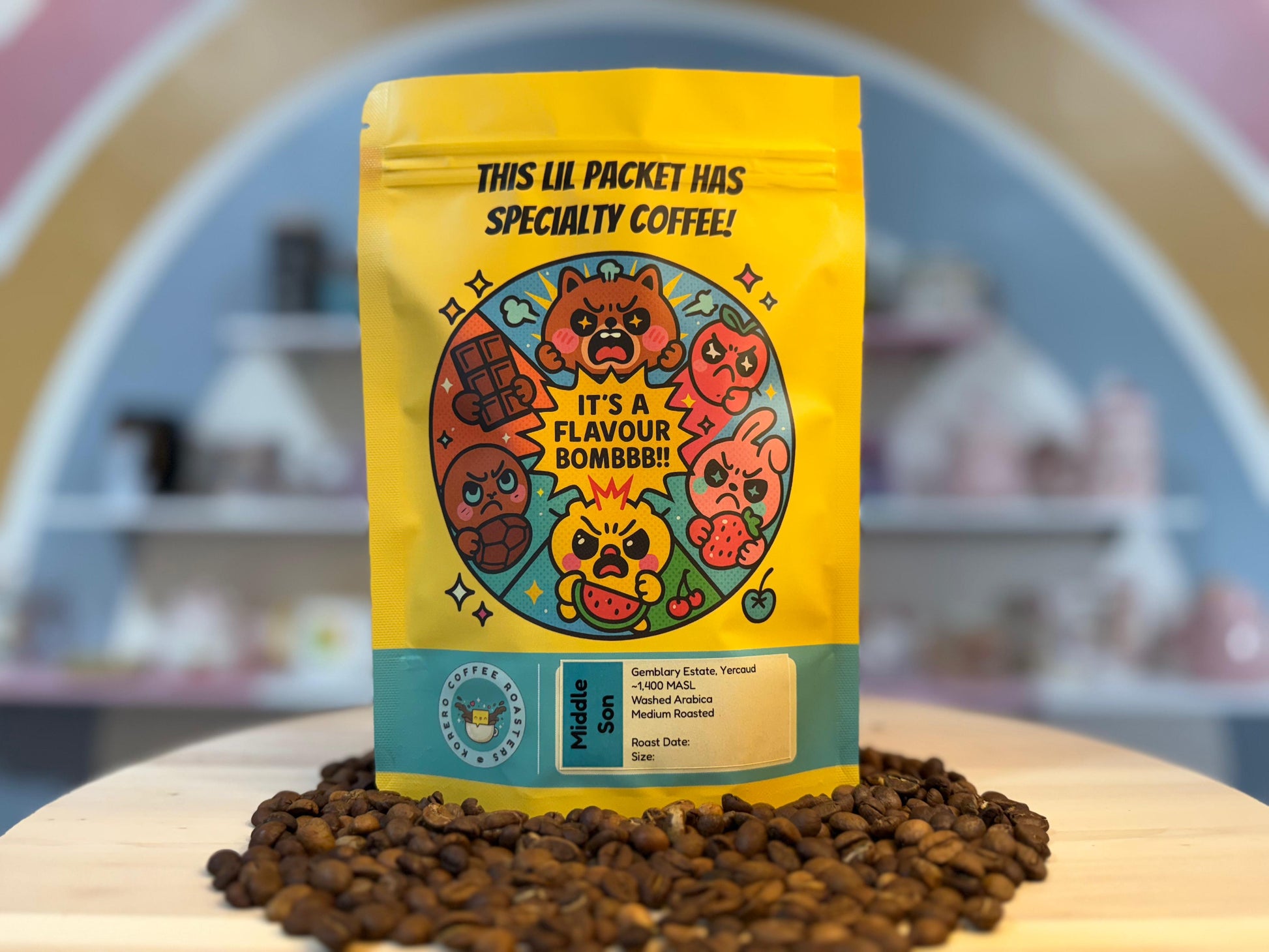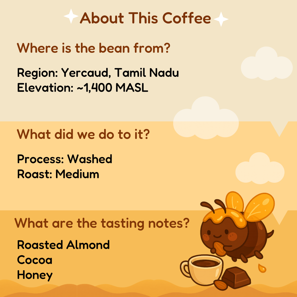 Medium roasted coffee beans (and ground if you want it that way), born in the hills of Yercaud, Tamil Nadu. Has a balanced cup quality, playing across flavours which don't overpower and find a middle ground across nutty, chocolaty, fruity and floral notes.